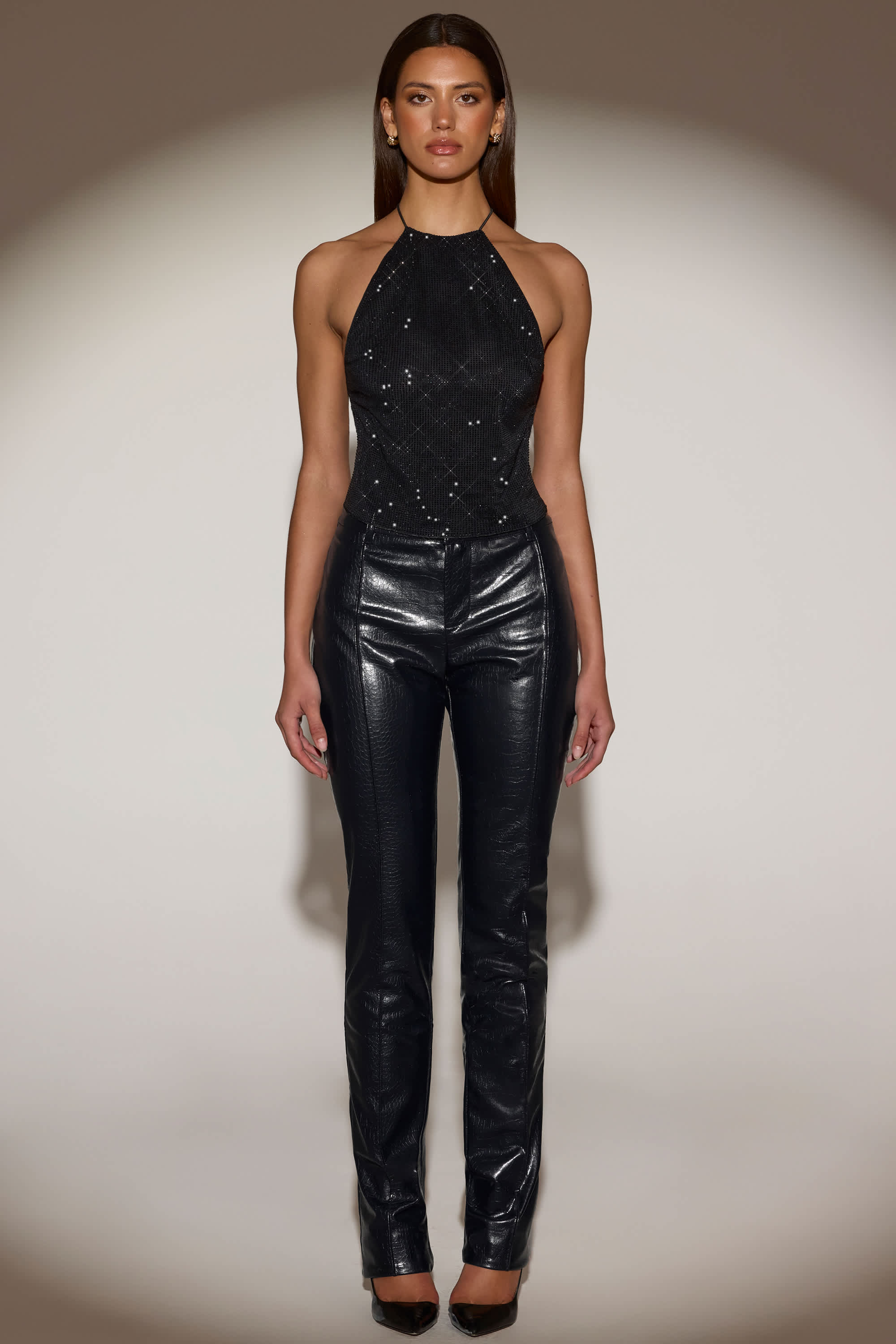 Keep it luxe. Perfect for evening plans, the Nemyra straight-leg trousers are crafted from our premium faux-leather fabric with a glossy croc-effect finish that pairs perfectly with a sparkly top in the same tone. Cut to a low-rise silhouette for versatile styling, they feature belt loops and classic back pockets.