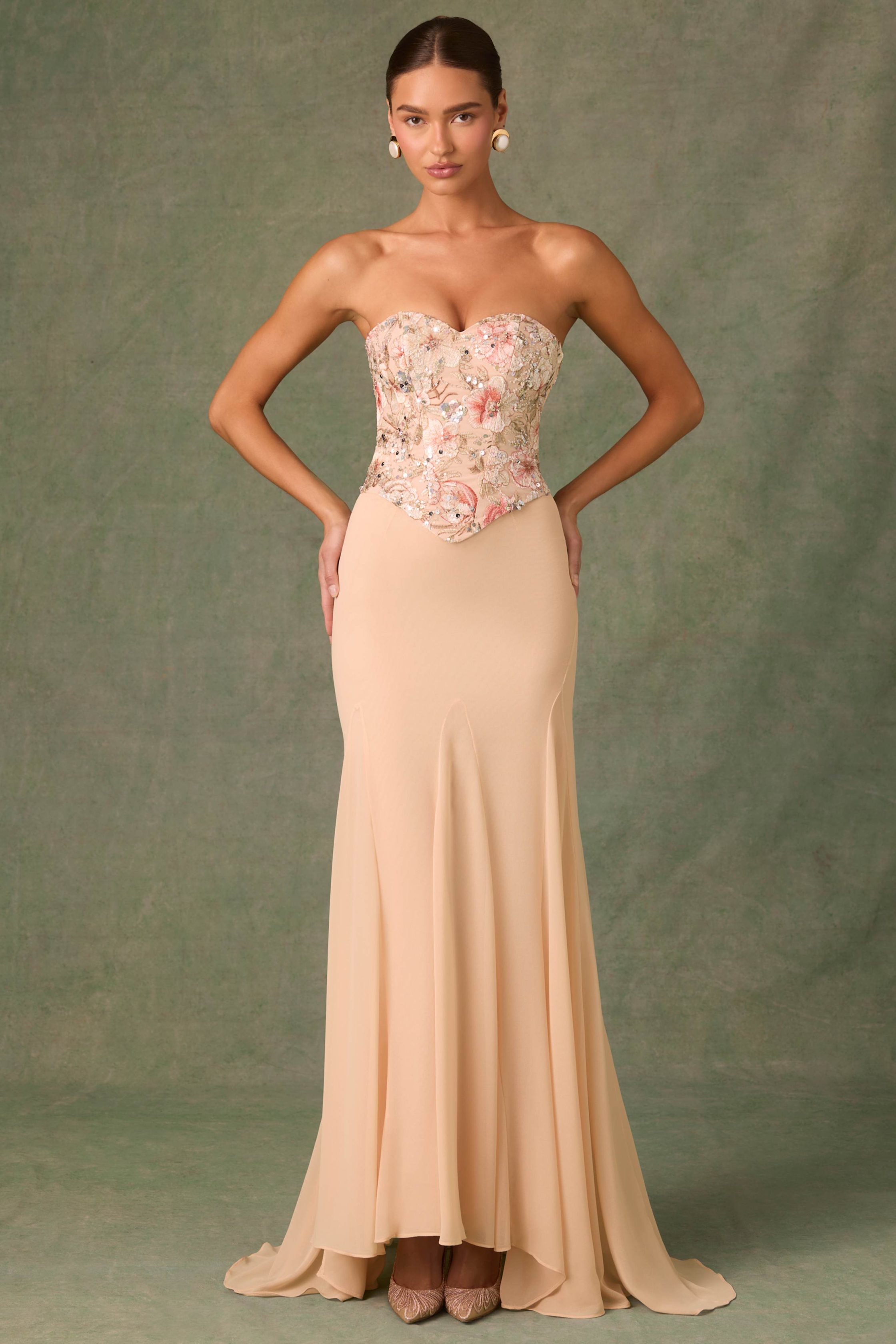 Divinely crafted. Spotted on the runway first, the Lysana gown is designed for extra-special occasions and features a fully embellished corset bodice overlaid with watercolour-inspired custom floral appliqués brought to life with sparkling sequin embellishments. It features a floor-skimming chiffon skirt with godet pleats for dynamic movement and is complete with signature lace-up detailing at the back that can be adjusted for your perfect fit.
