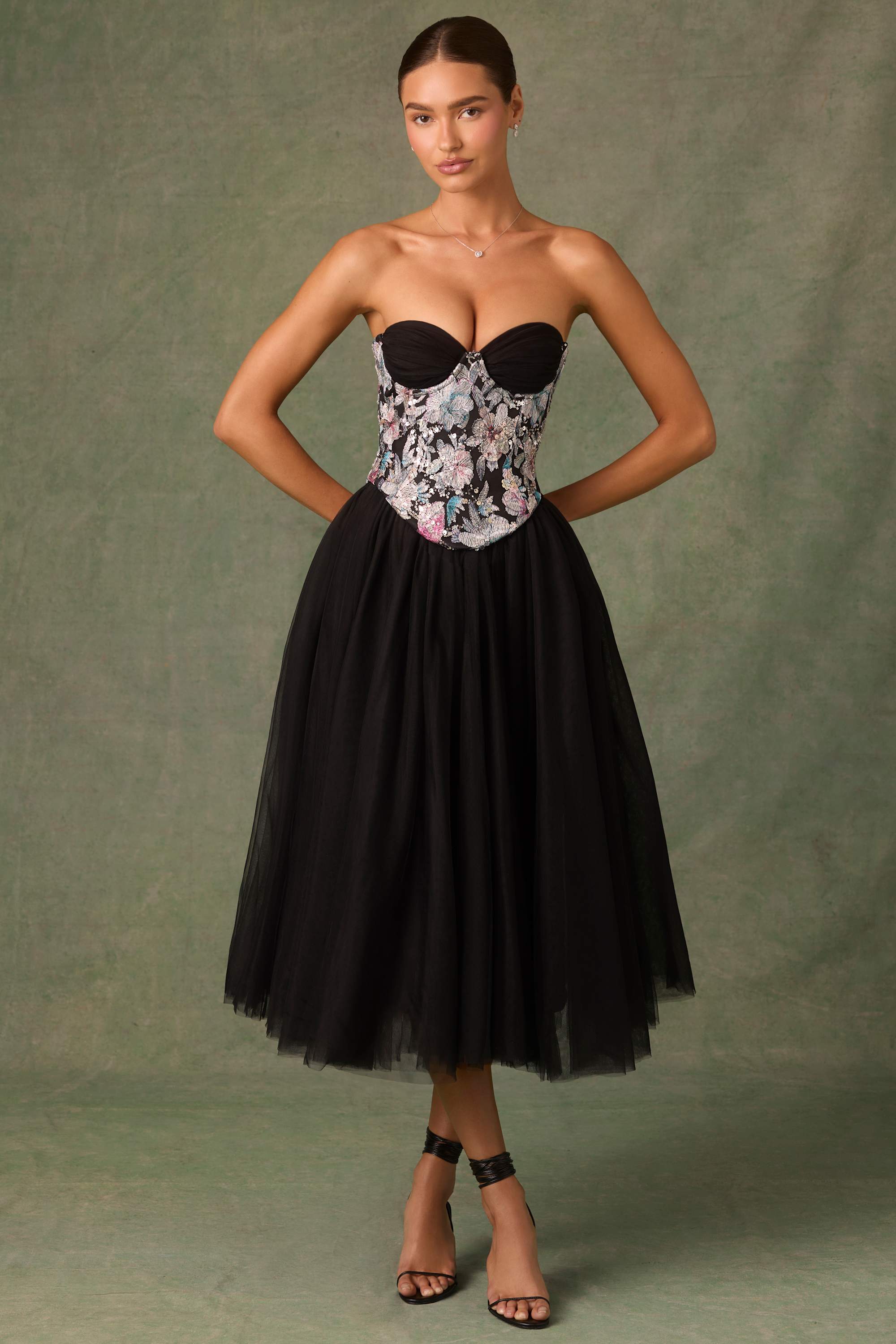 A fresh take on classic styles, the Elia corset is designed to add interest to any look. It’s crafted from figure-defining mesh fabric, overlaid with custom watercolour-inspired floral appliqués and the perfect topping of sparkling sequins. Cut to a cupless silhouette for versatile styling, it’s framed with a curved hem for instant sculpting and features an adjustable lace-up back for your perfect fit every time.