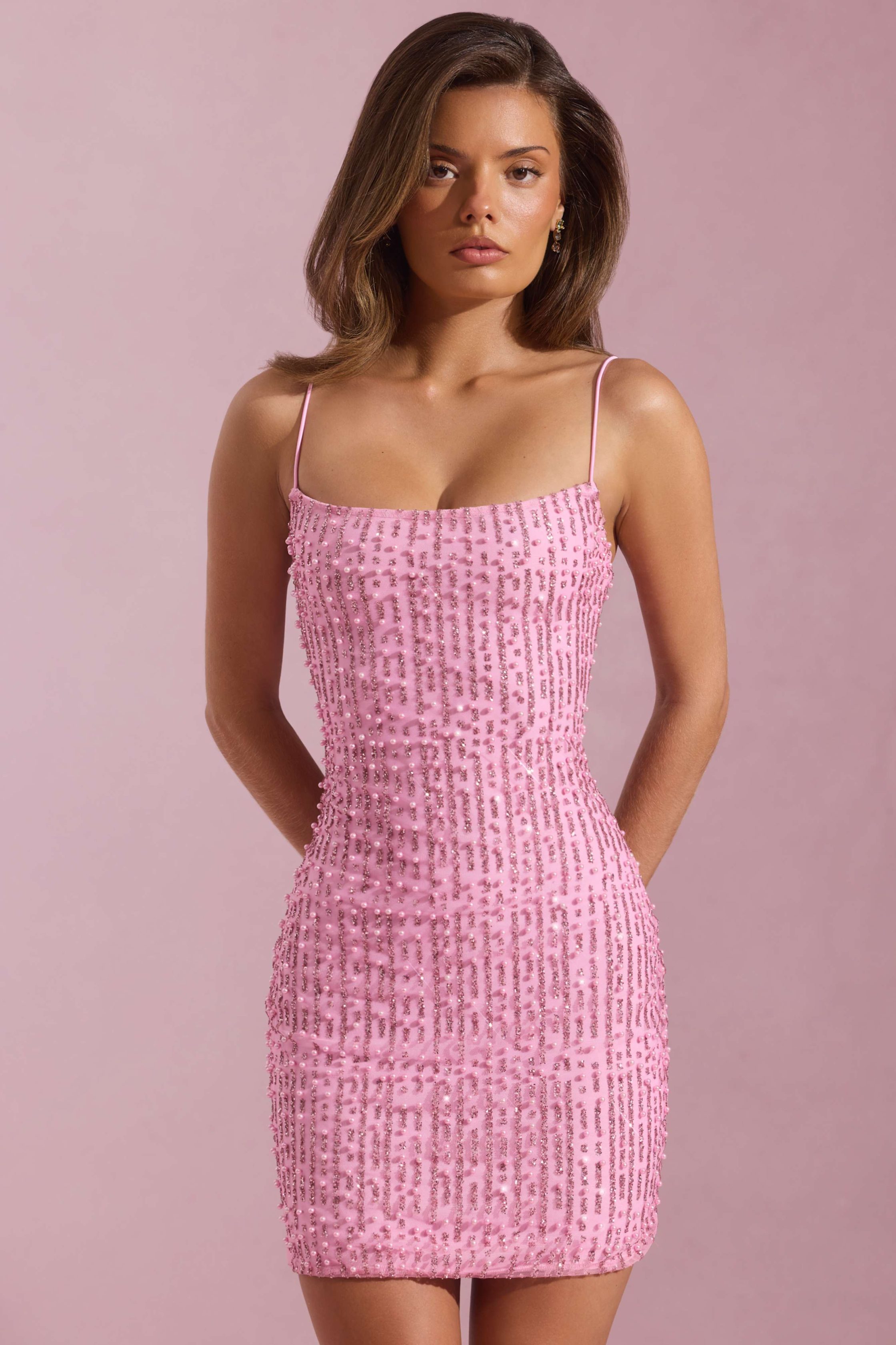 Embellished Scoop-Neck Bodycon Mini Dress in Pink