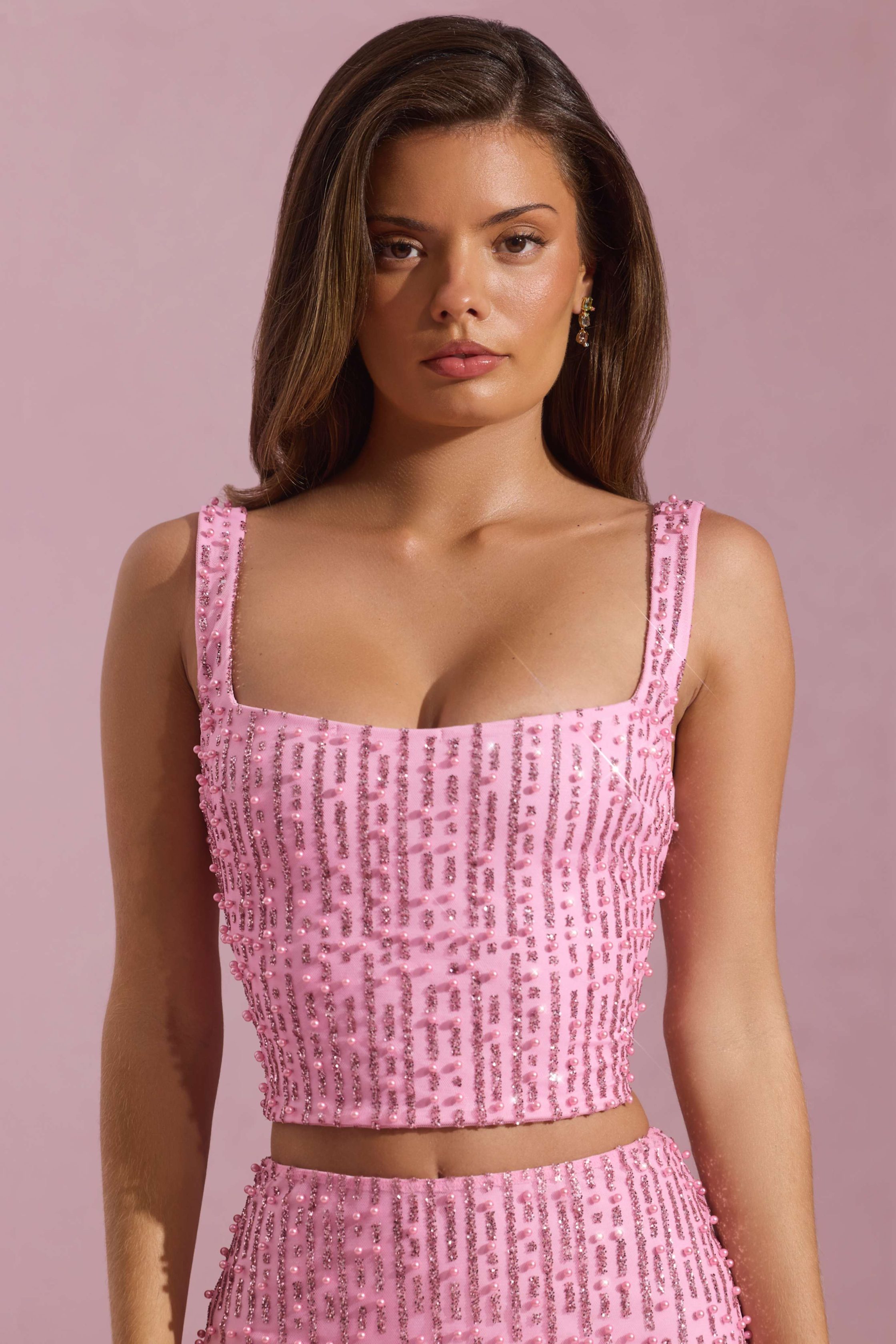 Embellished Square-Neck Crop Top in Pink