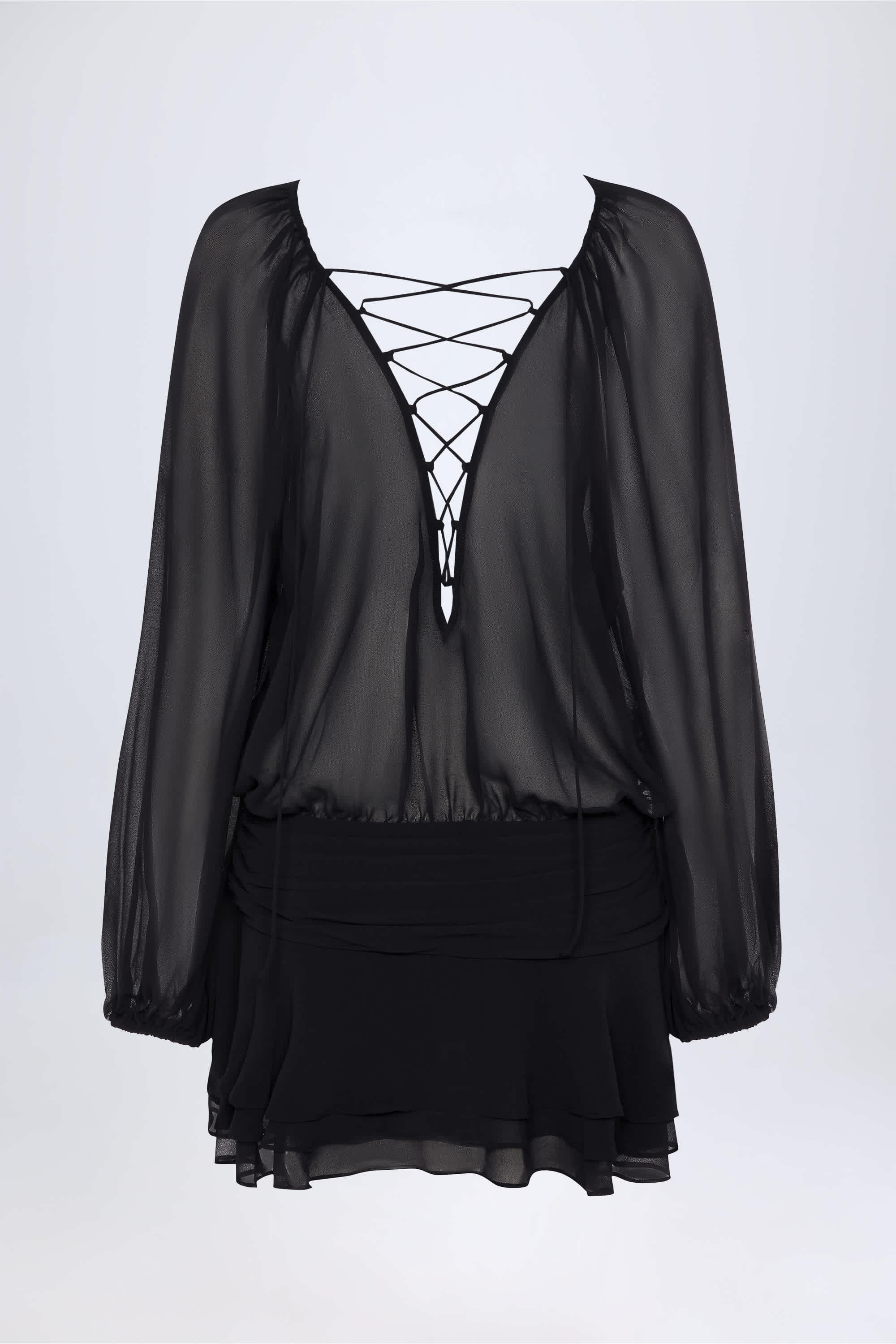 For the dreamers and all-day dancers, the Avalon mini dress is crafted from premium, lightweight georgette. It’s cut to a relaxed silhouette with a semi-sheer loose bodice, framed with oversized balloon sleeves and features a layered mini skirt. It’s complete with a plunge neckline anchored with functional lace-up ties for custom coverage.