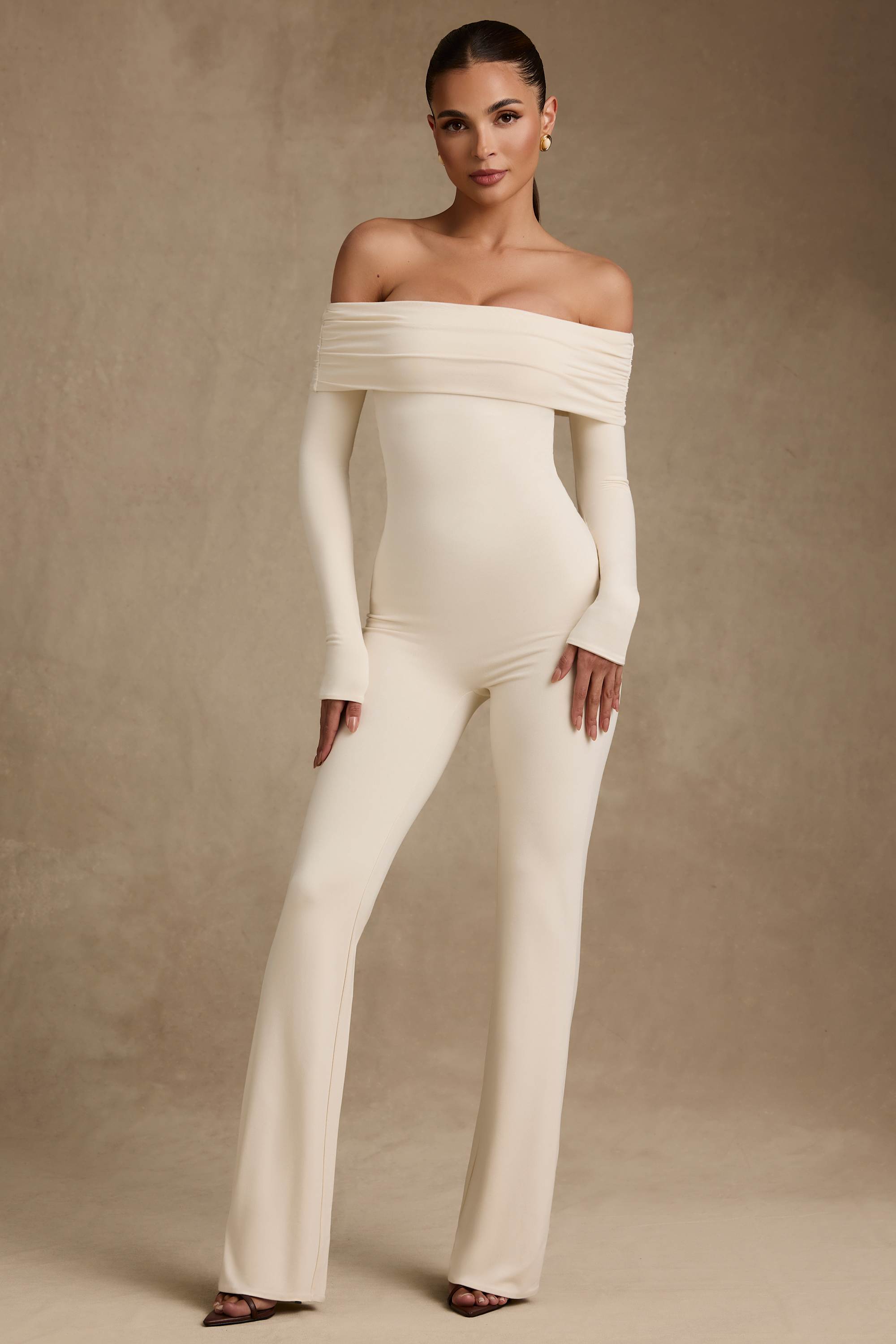 Effortless and endlessly chic. Perfect for creating put-together looks that transition seamlessly from day-to-night plans, the Agnesa jumpsuit is crafted from buttery soft and stretchy jersey made with TENCEL™ Modal fibres that support a natural dry feeling through moisture control. It features a ruched off-shoulder neckline and universally flattering flared legs for versatile styling.