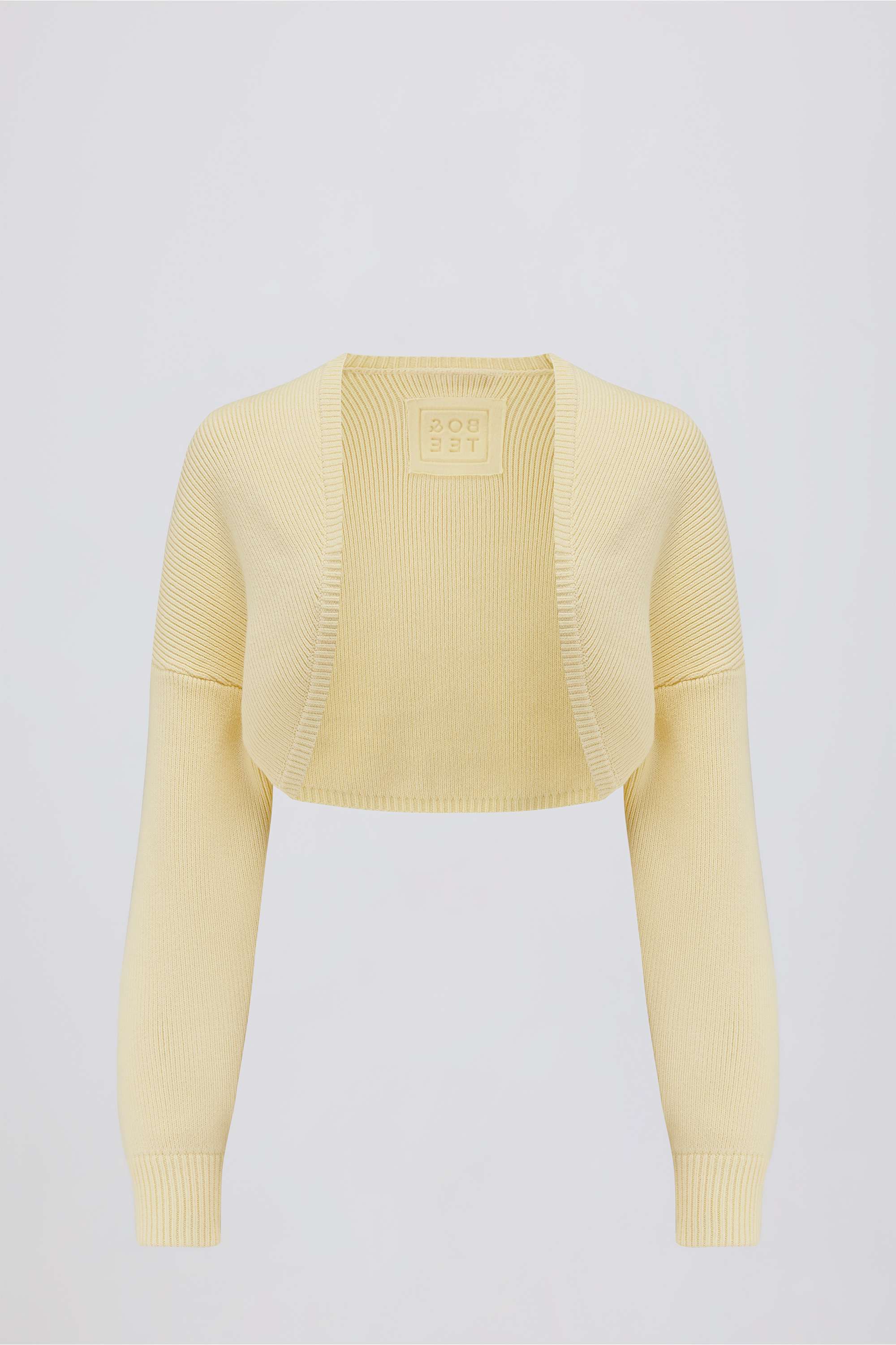Deliciously smooth layers. Ideal for pairing with separates from the collection, this cropped shrug is crafted from cotton-blend ribbed-knit fabric that’s naturally soft and breathable. It features a curved front, drop shoulders and cuffed sleeves that accentuate the relaxed feel, and it’s elevated with an embossed Bo+Tee logo at the back.