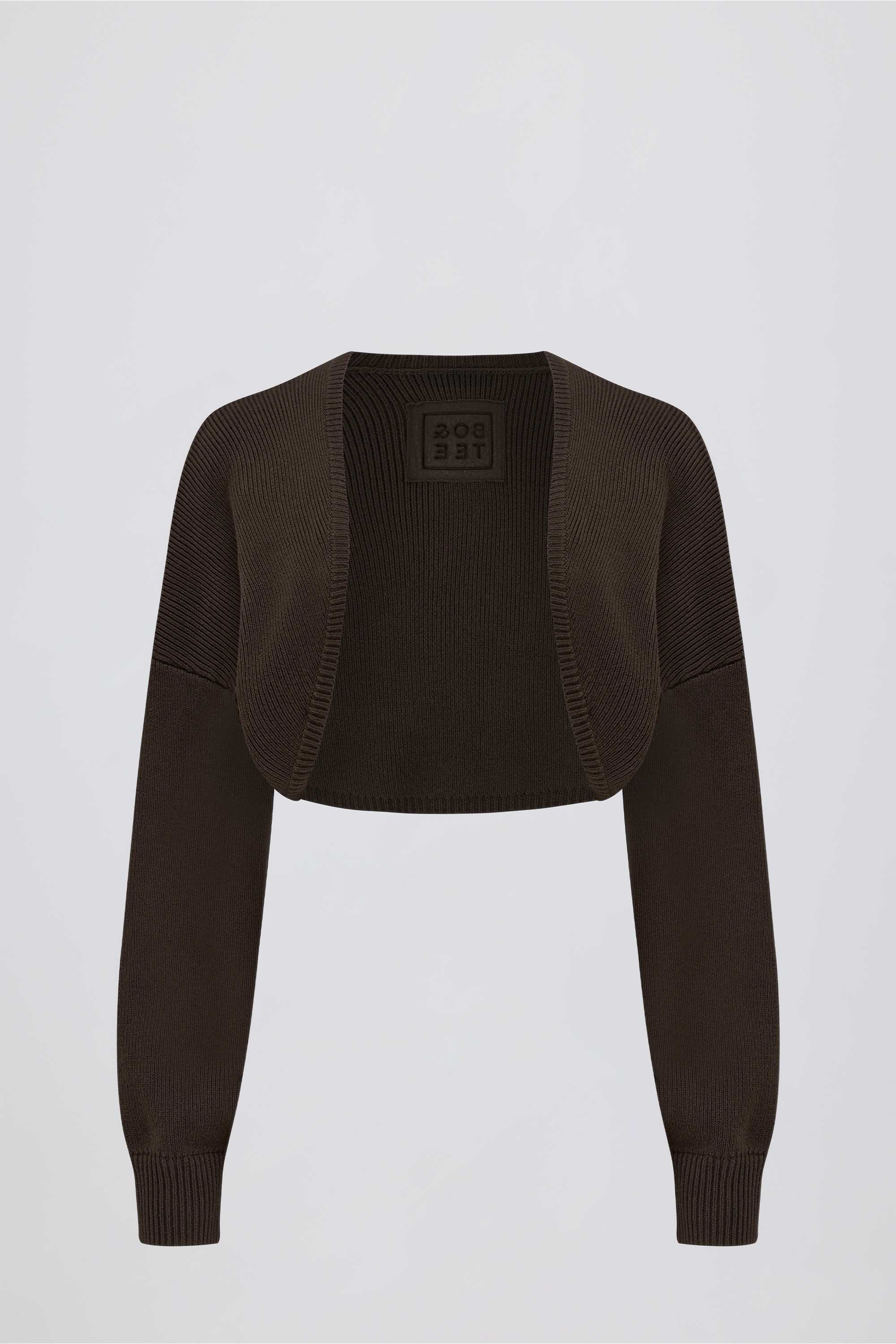 Deliciously smooth layers. Ideal for pairing with separates from the collection, this cropped shrug is crafted from cotton-blend ribbed-knit fabric that’s naturally soft and breathable. It features a curved front, drop shoulders and cuffed sleeves that accentuate the relaxed feel, and it’s elevated with an embossed Bo+Tee logo at the back.
