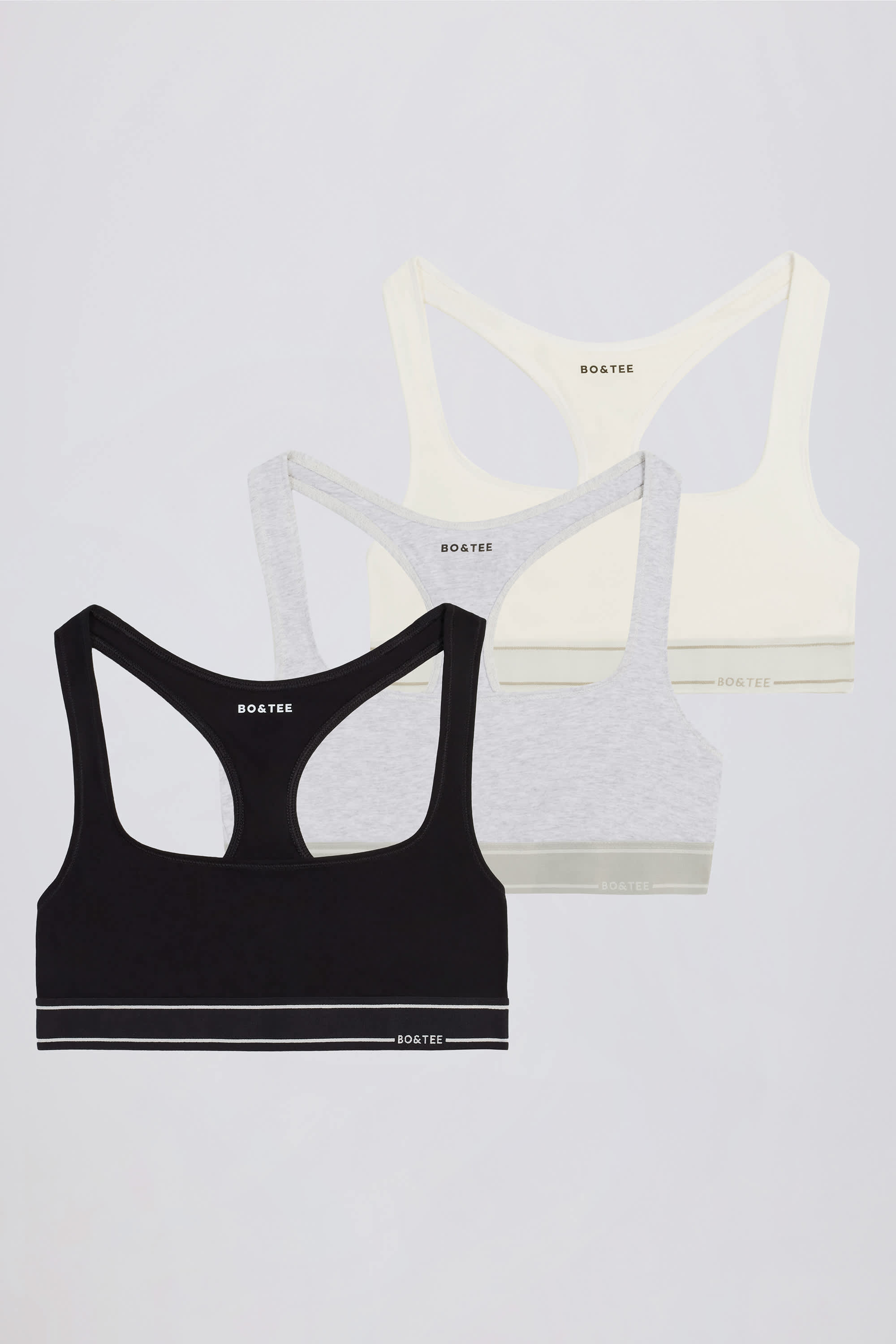 All-day comfort. Modelled on classic sporty styles, this bundle includes three non-padded, scoop-neck bralettes crafted from soft and breathable stretch-cotton jersey with a racerback silhouette and supportive straps. Each one is complete with a flexible branded underband that allows maximum range of motion.