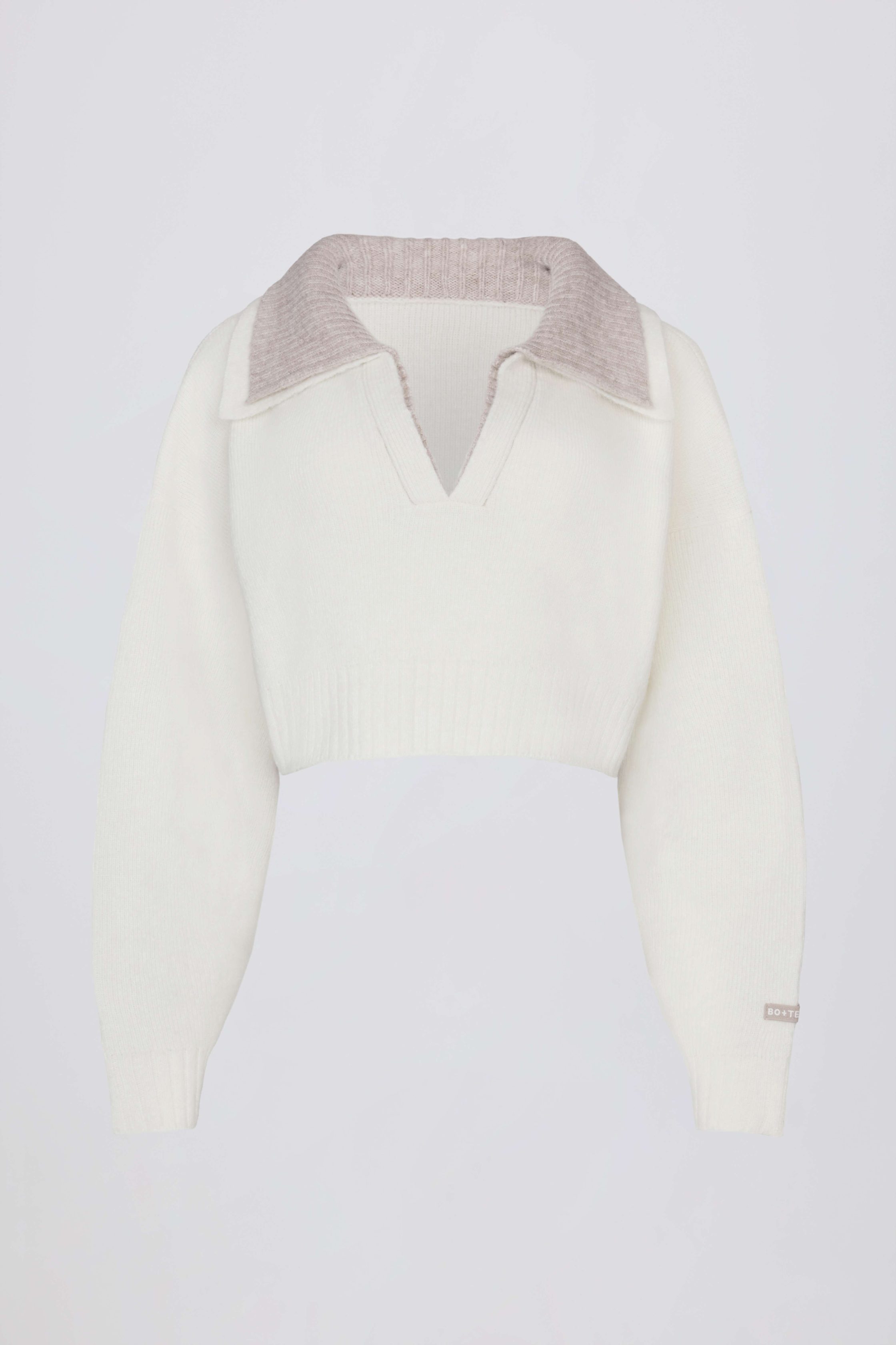Layers you’ll love. An elevated take on a classic, this cropped jumper is framed with a double-layered collar for a statement twist on a relaxed design. Spun from super soft knit fabric with a touch of wool, the boxy silhouette is accentuated with the contrasting ribbed cuffs and hem.